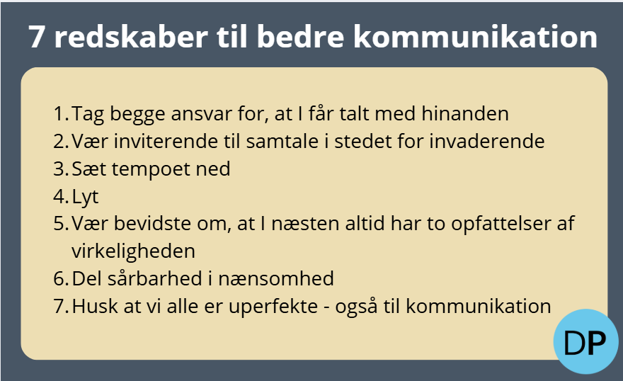 Der er uden tvivl flere gode redskaber til bedre kommunikation. Men man kommer langt med dem, som er delt her. Og så er det altid værd at huske, at vi alle er uperfekte – og at vi kun kan gøre os umage og så lære at leve med det uperfekte. Lykke til med at tage redskaberne til bedre kommunikation frem og gøre flittigt brug af dem.